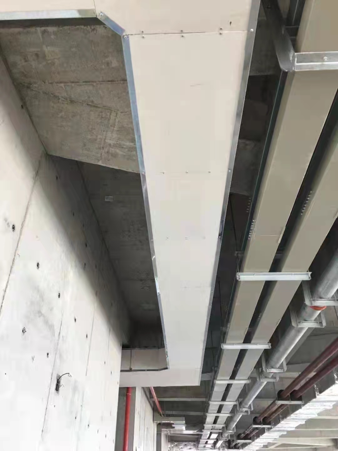 風(fēng)管包覆硅酸鹽防火板,是在已吊裝好的鐵皮風(fēng)管外再包一層硅酸鹽防火板,讓其提高防火性能。一般鐵皮風(fēng)管需要防火1H和2H或更長(zhǎng)時(shí)間的時(shí)候,就用相應(yīng)厚度的硅酸鹽防火板作為防火層進(jìn)行包覆